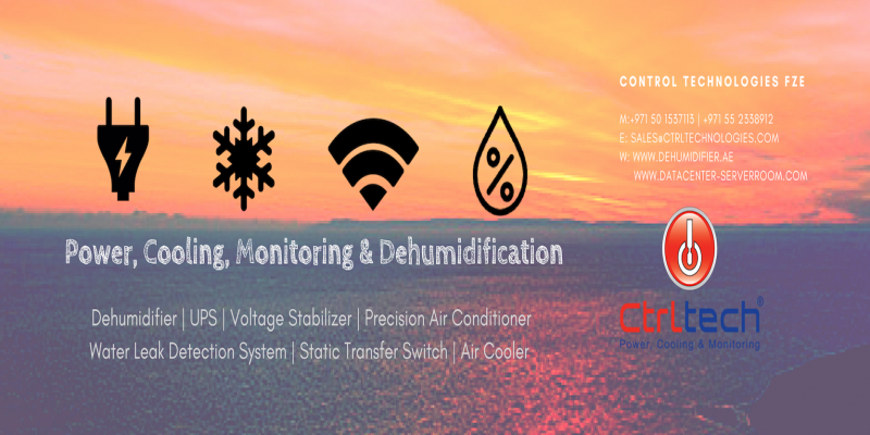 Control Technologies FZE (CtrlTech) offers Power, Cooling, & Monitoring solutions for Server room & Datacenter. We offer dehumidifiers, voltage stabilizers, water leak detection systems, and voltage regulators. Dehumidification products include industrial dehumidifiers and swimming pool dehumidifiers. Besides, our product fleet consists of a precision air conditioner, air cooler, static transfer switch (STS), and frequency converters. Our other products include a leak detector, desert cooler, servo stabilizer, computer room air conditioner (CRAC), and desiccant dehumidifier.